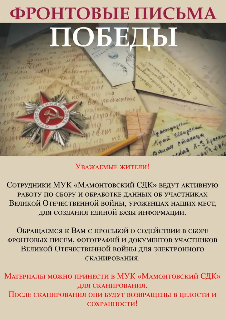 Просим вас помочь: если в ваших семейных архивах сохранились фронтовые письма, фотографии или документы, связанные с героями войны, вы можете принести их в Дом культуры для сканирования.