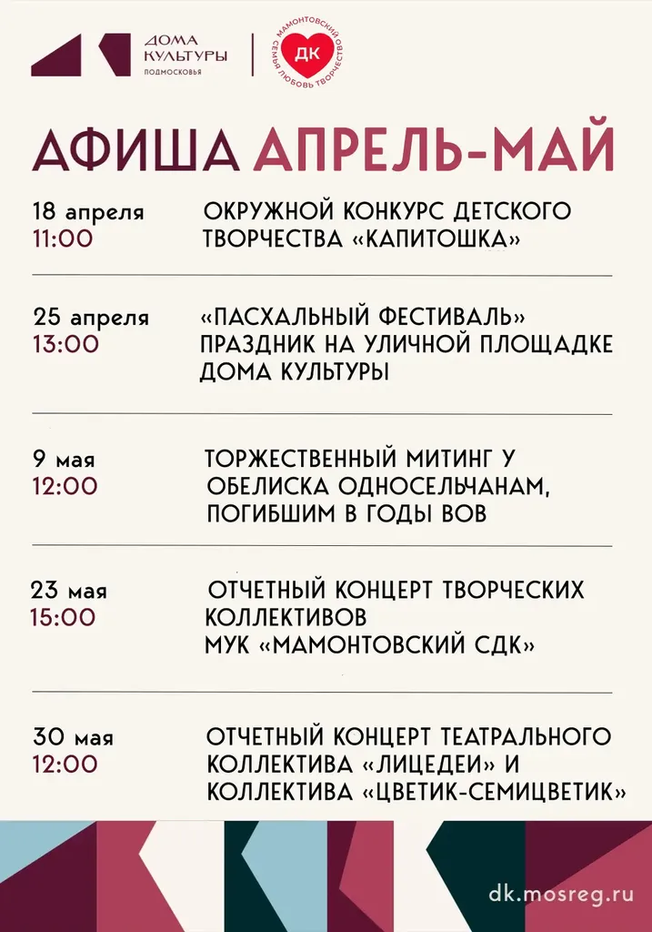 АФИША МУК «МАМОНТОВСКИЙ СДК» НА АПРЕЛЬ–МАЙ