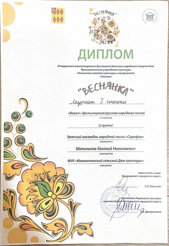 С большой радостью сообщаем, что детский ансамбль народной песни «Сарафан» под руководством Мельникова Евгения Николаевича, аккомпаниатора Андрея Анатольевича Дмитренко, стал Лауреатом I степени! 🏆