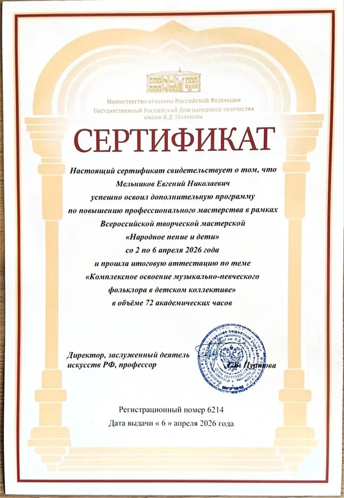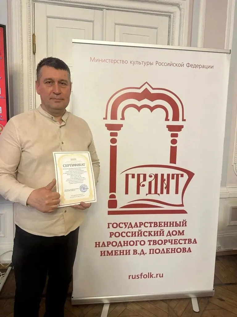 Особенно приятно отметить, что участие в мастерской принял и успешно прошёл обучение руководитель ансамбля народной песни «Любава» и детского ансамбля народной песни «Сарафан» Мельников Евгений Алексеевич.