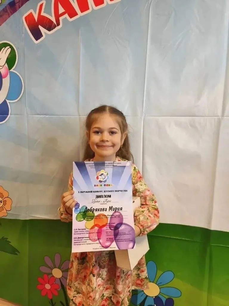 🌺 Мария Добрикова, участница коллектива сольного пения «Анютины глазки» (руководитель: Ирина Николевна Сыромятникова, КЦ «Красный Электрик»), – победитель Гран-При младшей возрастной категории конкурса.